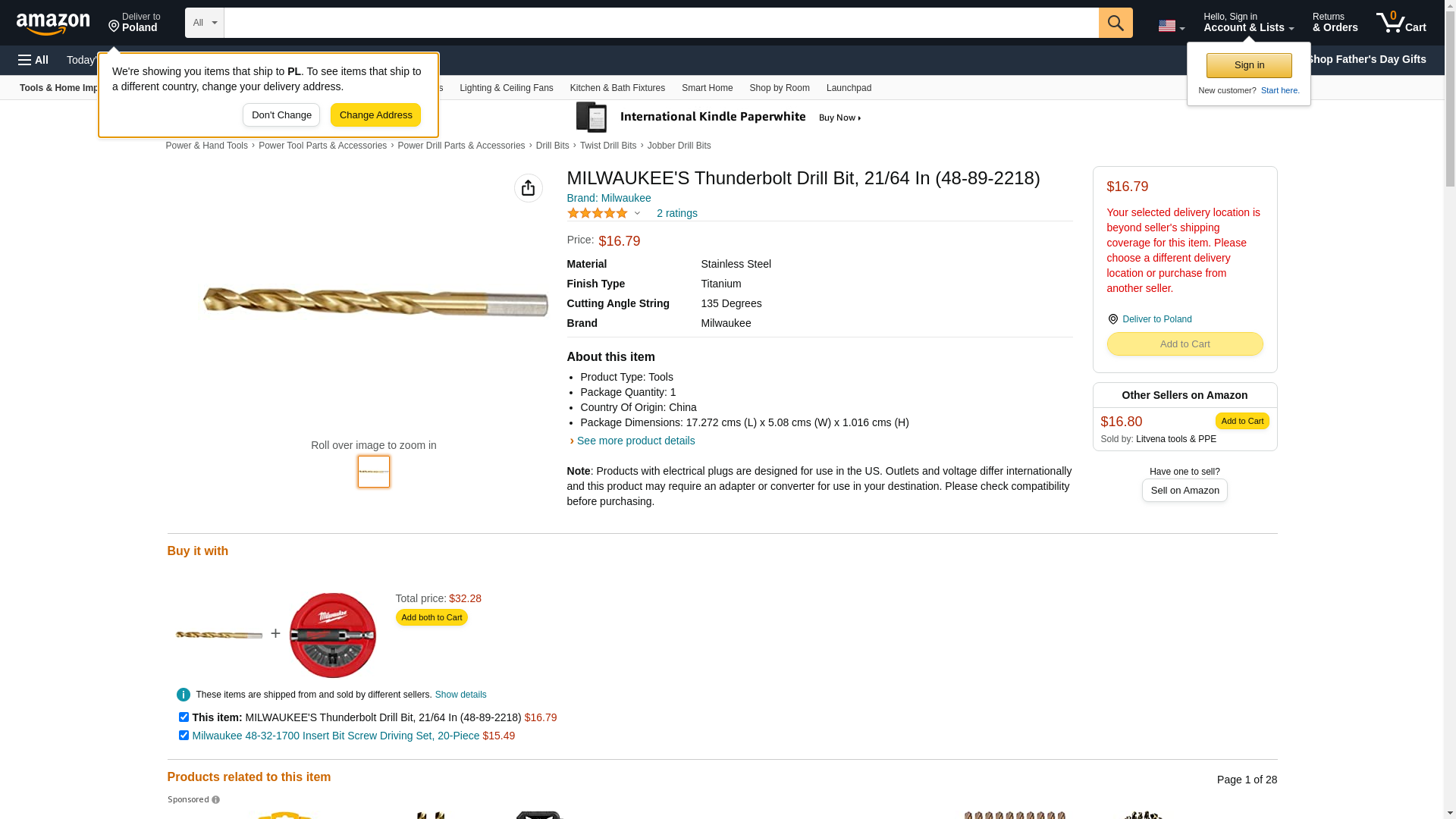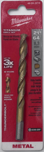 21/64" Thunderbolt Titanium Coated Drill Bit Milwaukee thunderbolt titanium coated drill bits are designed for extreme durability and long life. The thunderbolt web features a thicker core than a standard drill bit, which provides ultimate strength and protects against side-load breakage. A specially designed parabolic flute form clears chips and debris fast to keep the bit cool. A precision start, 135 split point tip starts on contact to keep the bit from walking for fast accurate holes. Excellent for drilling on curved surfaces, requires less effort to drill and is highly recommended for use with portable drills. Features: 21/64" Diameter 3-Flat Secure Grip Shank Titanium Construction Since its founding in 1924, Milwaukee has focused on a single vision: To produce the best heavy-duty electric power tools and accessories available to the professional user. Today, the Milwaukee name stands for the highest quality, durable and reliable professional tools money can buy.