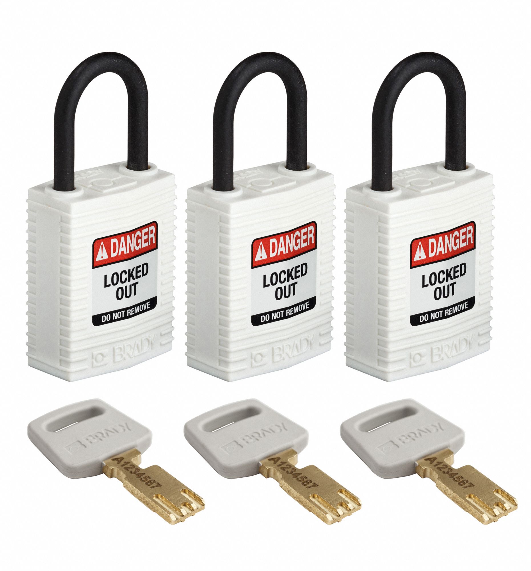 Brady SafeKey Lockout Padlock - Nylon - White - 1.0" Plastic Shackle Vertical Clearance - Keyed Alike (Pack of 3)