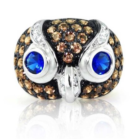 The distinct face of this wise owl will make you feel smart in no time. Dazzling champagne colored czs create the brown feathers of this mystical creature on a black rhodium background while bright blue czs make his large all knowing eyes. Clear czs adorn his beak and eyebrows for a contrasting look. Made of rhodium plated brass, this owl cocktail ring is unlike some cheap fashion jewelry as it combines bold style with whimsical flair. Wear it for years to come and know that it will always look glamorous. This intelligent animal is often depicted with a graduation cap, so give this piece to a grad as a fun graduation present. She will definitely have a hoot wearing it.