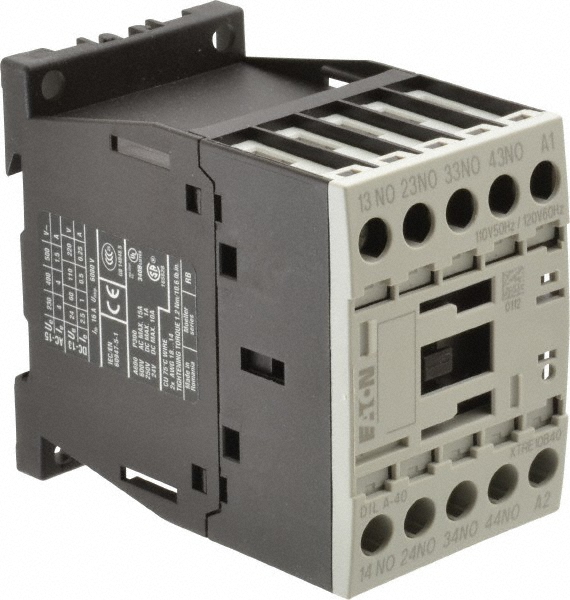IEC Control Relays DIN rail mount Front access contact and coil terminalsXT/DIL M Series feature positively driven contacts between the relay and auxiliary contact modules, and within the auxiliary contact modules. Provide AC control from 12V to 550V 50 Hz, 600V 60 HZ, and DC control from 12V to 220V. Silver tin oxide alloy contact material. Screw or spring-cage terminals and 4-pole configurations. Nonlatching type.UL Listed, CSA and CE Certified.<br /><br /> Item - Relay: IEC Style Control Relay<br /> Coil Volts: 120VAC<br /> AC Contact Rating - Relay: 6A @ 240V<br /> DC Contact Rating - Relay: 10A @ 24V<br /> Number of Pins - Relay: 10<br /> Contact Form - Relay: (4) SPST-NO<br /> Mounting - Relay: DIN Rail<br /> Power Consumption - Relay: 3.3VA<br /> Body Height - Relay: 2.68"<br /> Body Width - Relay: 1.77"<br /> Body Depth - Relay: 2.95"<br /> Overall Height - Relay: 2.68"<br /> Hz - Electrical: 50 Hz, 60 Hz<br /> Response Time: Less Than 21 msec<br /> Contact Material: Silver Tin Oxide Alloy<br /> Features: 4-Pole Configurations, Available with Screw or Spring Cage Terminals, IP20 Finger and Back-of-Hand Proof<br /> Standards: UL, CSA, CE<br />