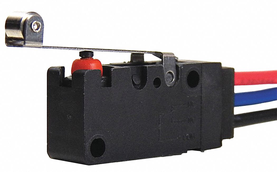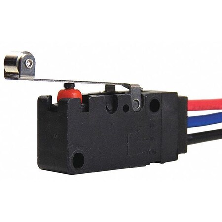 'Watertight Snap Switch, Series V-Basic, Type of Actuator Long Roller Lever, 1.33 In. Actuator Length, Contact Form SPDT, Current Rating 0.1A, Voltage Rating 250VAC, Terminal Type Lead Wires, Operating Force 120 gf max., Max. Pretravel 0.13 In., Release Force 20 gf max., Differential Travel 0.05 In., Over Travel 0.05 In., Length 1.3 In., Height 0.63 In., Depth 0.41 In., Mounting Dimension 22.20 x 10.3mm Centers, Operating Temp. Range -40 Degrees to 185 Degrees F'