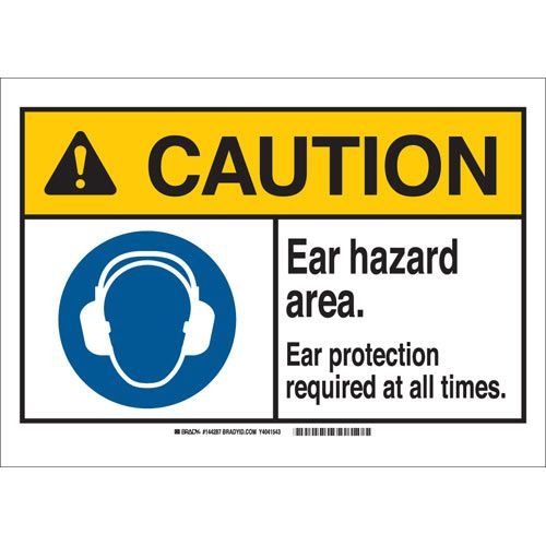 Brady 144285 CAUTION Ear Hazard Area. Ear Protection Required At All Times. Sign - Light Duty Plastic - Black/Blue/Yellow on White - 7 x 10