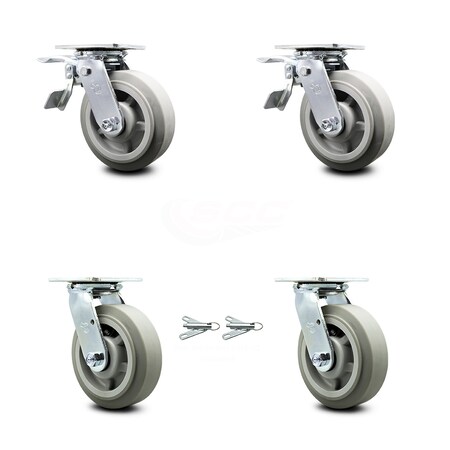 Thermoplastic Rubber Flat Tread Swivel Top Plate Caster Set 4 w/6" x 2" Gray Wheels-Includes 2 Swivel with Total Lock Brakes& 2 Swivel w/Bolt on Swivel Locks-2000 lbs Total Cpty- Service Caster Brand