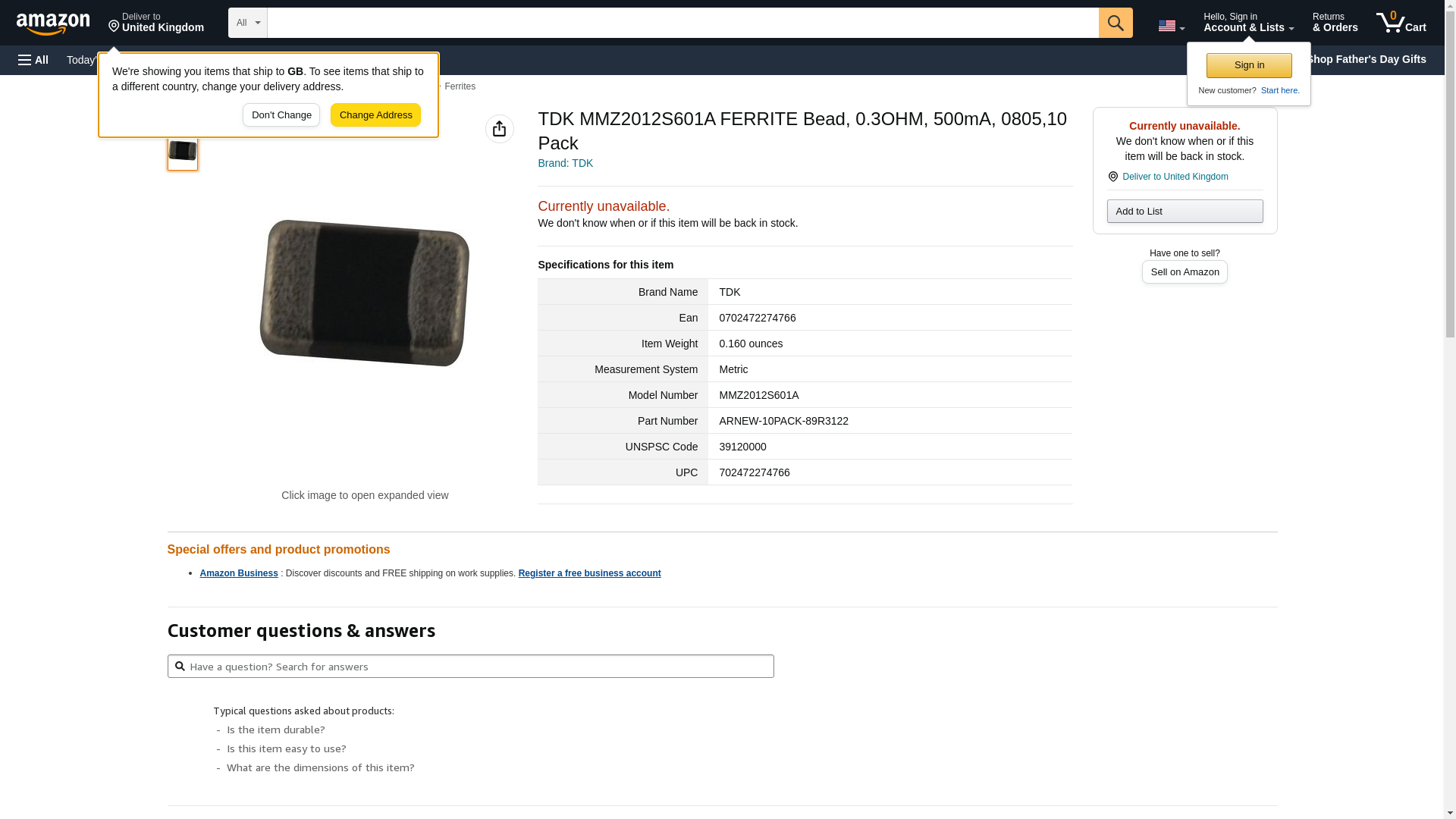 | Feature | <b>Price For:</b> Pack of 10<b>Order Unit:</b> Tape & Reel Full\xa01 <b>DC Current Rating:</b>: 500 <b>DC Resistance Max:</b>: 0.3 <b>Ferrite Case Style:</b>: 0805 [2012 Metric] <b>Ferrite Mounting:</b>: SMD <b>Impedance @ 100Mhz:</b>: 600 <b>Impedance Tolerance:</b>: \xb1 25% <b>Product Range:</b>: MMZ Series <b>SVHC:</b>: To Be Advised |