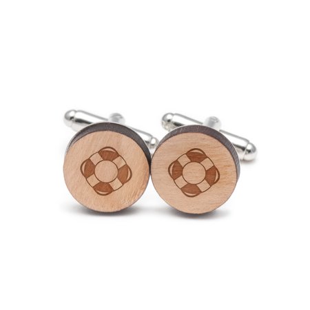 <ul> <li>Life Buoy Cufflinks, Wood Cufflinks Hand Made in the USA</li> <li>Materials: Made from premium cherry wood.</li> <li>Dimensions: Cufflink circle is 14mm x 14mm. 3mm thickness</li> <li>Laser Cut & Etched in USA</li> </ul>