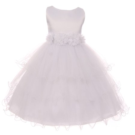 <ul> <li>A pure white dress from Shanil Inc for little princesses</li> <li>Fitted bodice and skirt with multiple layers and curly wired hem</li> <li>A floral embellished waist adds style and flavor</li> <li>V-shaped back with zipper fastening and ribbon tie</li> <li>Sizing is based on U.S. clothing size standards</li> </ul>