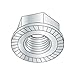 Hex nut with an enlarged circular base flaring out from the bottom of the nut. The bearing surface of the flange has serrations which displace material on the mating surface when the nut is wrenched into place, forming a connection which resists loosening.