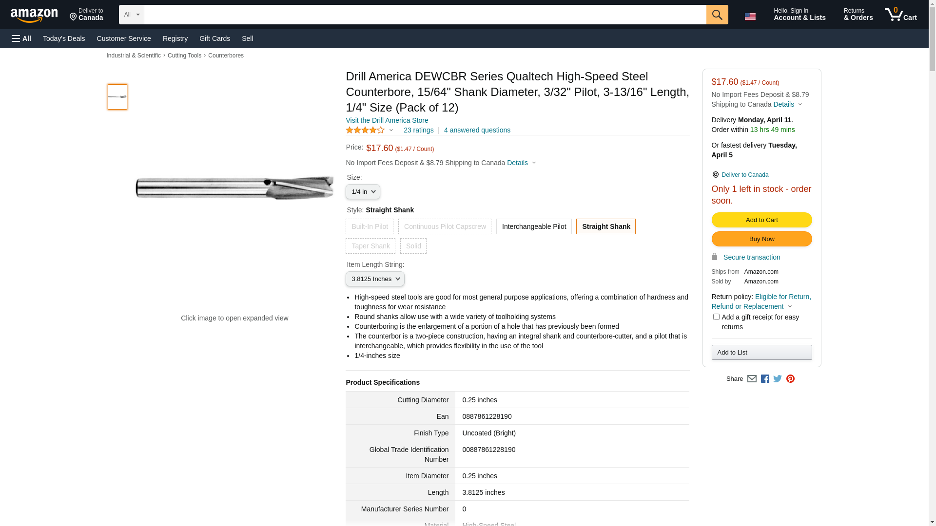 Drill America DEWCBR Series Qualtech High-Speed Steel Counterbore, 15/64" Shank Diameter, 3/32" Pilot, 3-13/16" Length, 1/4" Size (Pack of 12)