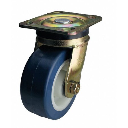 ' Swivel Plate Caster, Load Rating 750 lb., Wheel Dia. 5 In., Wheel Width 2 In., Overall Height 6-1/2 In., Wheel Material Polyurethane, Inside Bolt Hole Spacing 3 x 3 In., Outside Bolt Hole Spacing 2-5/8 x 3-5/8 In., Plate Type B, Wheel Color Blue, Core Material Polyolefin, Raceway Double Ball, Wheel Bearings Delrin(r), Replacement Wheel XA05205212G, Plate Size 4 x 4-1/2 In., Includes Top and Bottom grease Seals, Durometer 55 Shore D, Core Color White, Mounting Bolt Dia. 3/8 In. '