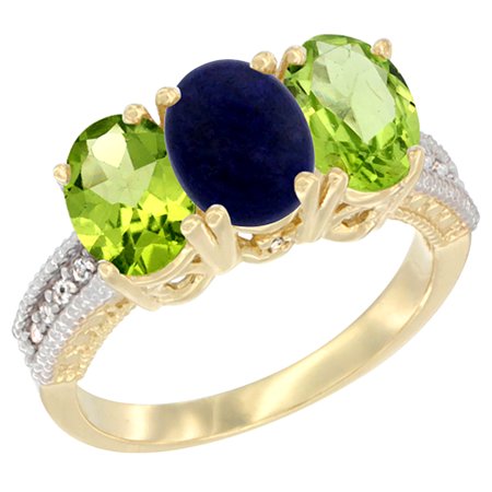 10K Yellow Gold Natural Lapis & Peridot Ring 3-Stone Oval 7x5 mm, sizes 5 - 10