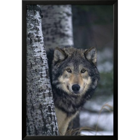 <ul> <li>Title: Gray Wolf behind Trees</li> <li>Artist: DLILLC</li> <li>Paper Type: Photographic Print</li> <li>Product Type: Framed Art Print</li> <li>Framed in SOHO Black</li> <li>Arrives ready-to-hang for fast, simple installation</li> <li>Framed Size: 26x38 in.</li> <li>Handcrafted in the USA</li> </ul>