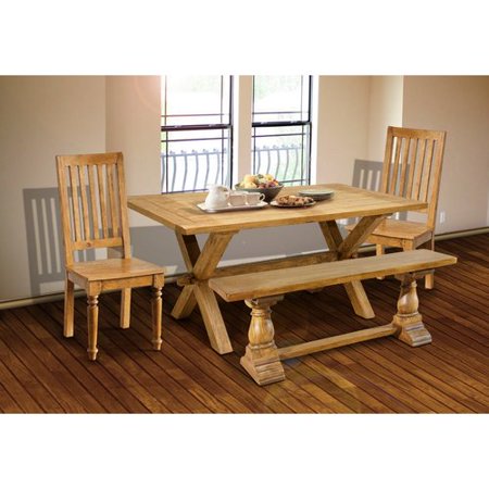 Features: -Set includes 1 table, 2 chairs and 1 bench. -Chesca collection. -Non-toxic stain. -Hand made. -Material: Solid Mango wood. -Highest manufacturing standards. Top Color: -Natural. Base Color: -Natural. Chair Color: -Natural. Table Top Material: -Wood. Table Base Material: -Wood. Chair Material: -Wood. Chair Back Style: -Slat back. Wood Tone: -Light Yellow Wood. Dimensions: Table: -Yes. Overall Table Height - Top to Bottom: -31". Overall Table Length: -34.5". Overall Table Width: -66.5". Overall Table Weight: -105 lbs.