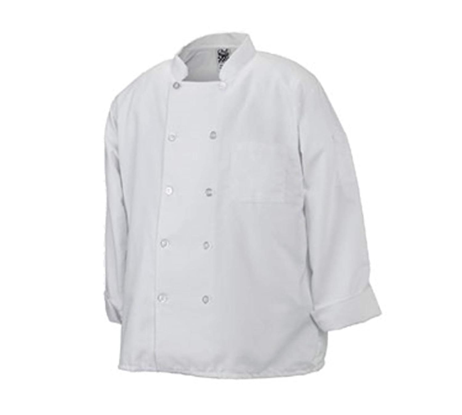 Long sleeve basic jacket, universal fit. Mandarin collar. Double breasted. One left chest patch pocket. Thermometer pocket on left sleeve. Heat resistant, clear pearl buttons. Made of heavy duty poly cotton 70/30 deluxe twill. White color. X-Large size.