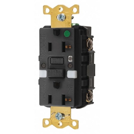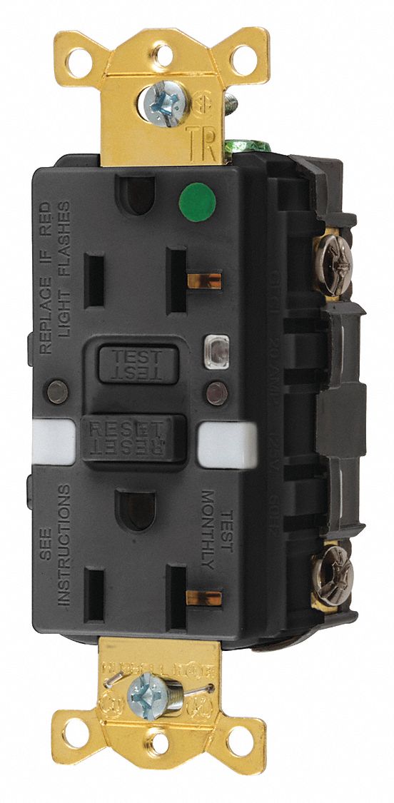 GFCI Receptacle, Connection Orientation Straight, Cover Type No Cover, Current Rating 20 A, GFCI Yes, Grounding Grounded, Housing Color Black, Housing Material Nylon, Mount Type Flush, NEMA Enclosure Rating 1, NEMA Receptacle Configuration 5-20R, Number of Gangs 1, Number of Poles 2, Number of Wires 3, Phase Single, Polarized Yes, Receptacle Type Duplex, Resistance Properties Tamper , Standards NEC, Voltage Rating 125V AC, Wire Connection Type Screw Terminals, Wiring Method Back, Side