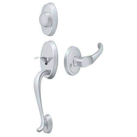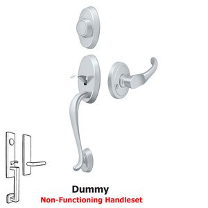 Dummy Set:Dummy handlesets have no latch or locking mechanism but give the appearance of a single cylinder handleset. Typically, dummy handlesets are used as a pull on the inactive side of a double door entry. Pair this with a single cylinder version to make a complete set for a full double door solution. This dummy set comes with both the exterior handleset and the interior. Features: Exceeds criteria for BHMA Grade 2 Security certification Constructed from brass for long lasting beauty and durability Installs in standard prep doors with door thickness of 1-3/8 Inch to 2 Inches Deltana includes a Limited 3 year and 1 year finish manufacturer warranty Specifications: Cross Bore: 2-1/8" Door Thickness: 1-3/8" to 2" Interior Projection: 2-3/8" Exterior Projection: 1-1/2" Lever Length: 4-1/2" Material: BrassProduct Variations: PRRHCH: Riversdale Keyed Entry Single Cylinder Handleset With Chapelton Lever PRRHDCH (This Model): Riversdale Dummy Set Handleset With Chapelton Lever