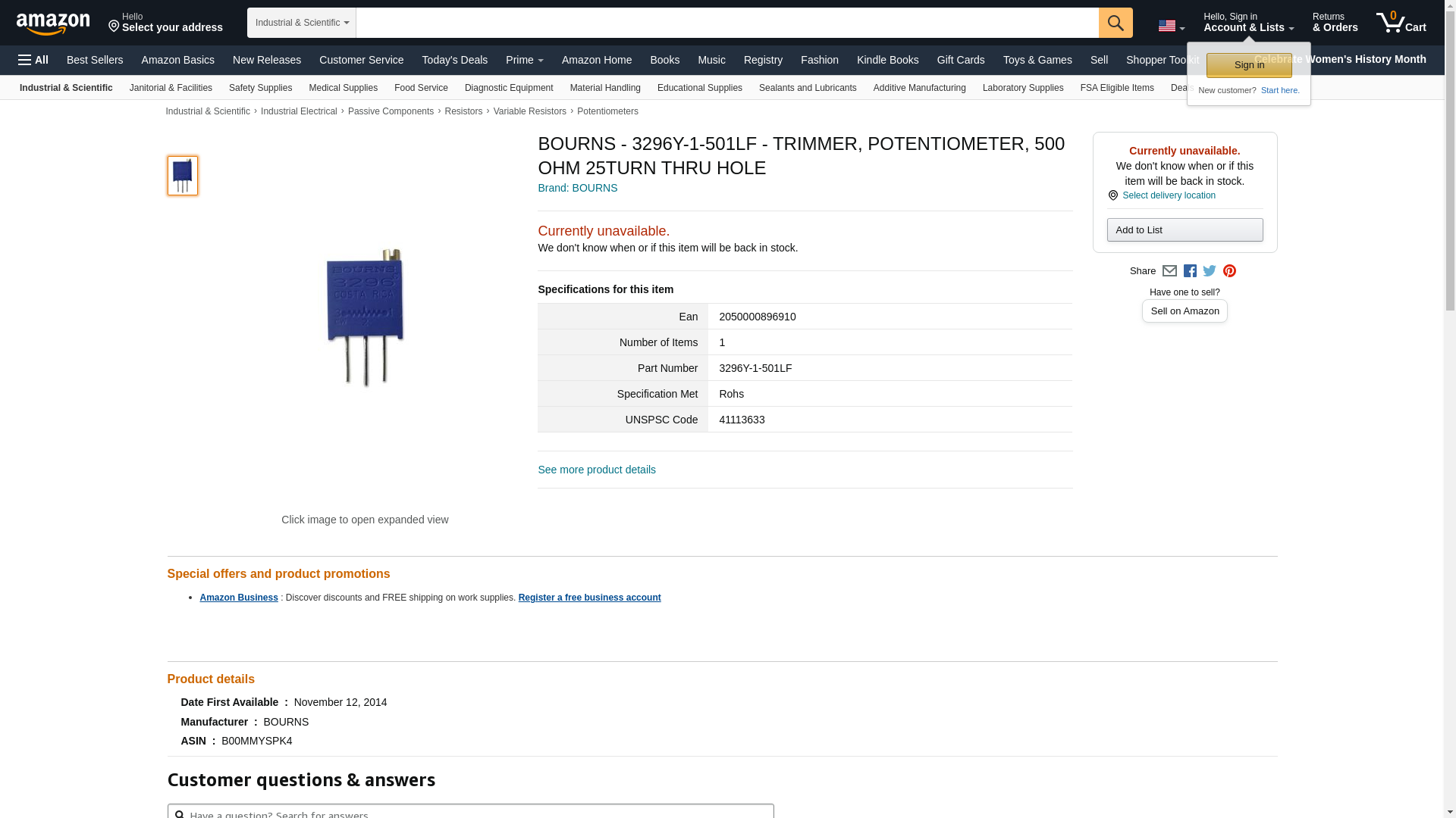 ![]() Onlinecomponents.com | 3296Y-1-501LF | 1 | 1075 | 1 | 1 @ $1.50, 25 @ $1.37, 100 @ $1.08, 200 @ $1.01, 500 @ $0.98 |