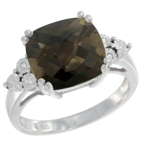Sterling Silver Natural Smoky Topaz Ring Cushion cut 11x11, Diamond Accent, sizes 5 - 10