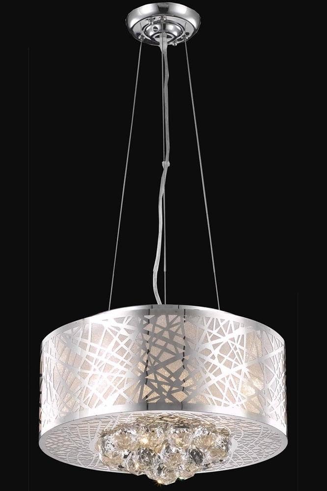 The Prism Collection features a round chrome finish frame with an intricately cut-out metal pattern. Clear crystal ball accents dangle inside the inverted bowl, glistening from this elegant ceiling light. A soft shade rings the inside of the frame to add ambiance to the glow given off from the bulbs tucked inside.