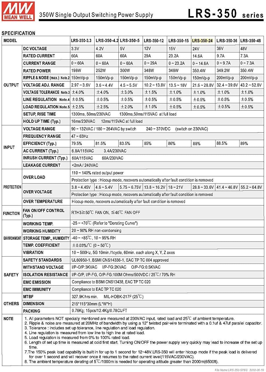 2_Pack Available (Check SIZE: LRS-350-24:2_PACK)-CONDITION: 100% Brand New -DC VOLTAGE: 24V -CURRENT RANGE: 0~14.6A -RATED POWER: 350W -INPUT VOLTAGE RANGE: 90 ~ 132VAC / 180 ~ 264VAC by switch 240 ~ 370VDC (switch on 230VAC) -EFFICIENCY: 88% -PROTECTIONS: SHORT CIRCUIT / OVER LOAD / OVER VOLTAGE / OVER TEMPERATURE -WEIGHT:760g -DIMENSION: 215 * 115 * 30 mm -CASE MATERIAL: Metal case / Aluminum base -CERTIFICATE: UL/CB -WORKING TEMPERATURE: -25~70 CASE temperature>50 FAN ON, CASE temperature<40 FAN OFF