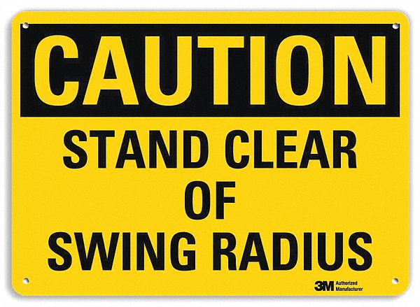 Caution Sign, Horizontal Rectangle, Number of Printed Sides 1, English, Sign Format Traditional OSHA, Sign Legend Stand Clear Of Swing Radius, Sign Legend Background Color Yellow, Sign Legend Style Text