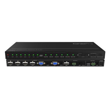 The KanexPro HDSC61D-4K is a 4-input HDMI, and 2-input VGA collaboration scaler ideal for switching up to six AV sources to one HDMI display. This switcher scaler also supports 4K resolutions up to 15 meters to match the latest display standards and performs a feature known as" Output Blacking" to mute the audio and video when switching between different sources, perfect for corporate boardrooms or small huddle rooms where HDMI, DisplayPort or VGA switching is needed to one display.</p><p>This 6-Input scaler-switcher also provides audio de-embedding through three de-embedded audio outputs: via 3.5mm stereo, phoenix connectors and a Toslink optical output. For control options, it can be paired virtually with any 3rd party control system using RS-232 drivers or controllable by front-panel buttons and IR remote control. </p><p><strong>Applications:</strong></p><p>Designed for classrooms, conference rooms, huddle rooms and other collaborative spaces where digital and analog sources need to be switched and scaled in a fast and reliable manner.</p>