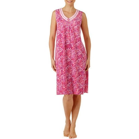 <ul> <li>Round neck sleeveless gown with delicate lace trim</li> <li>Pin tucks and shirring at yoke</li> <li>6 button placket</li> <li>Soft easy-care fabric in 65% polyester 35% rayon jersey: black soot multi large floral color is 100% cotton </li> <li>machine washable</li> </ul>.