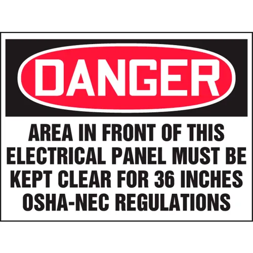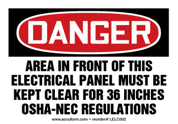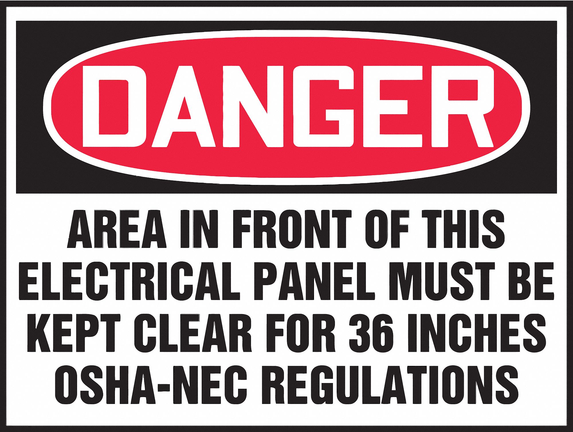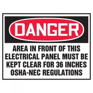 DANGER AREA IN FRONT OF THIS ELECTRICAL PANEL MUST BE KEPT CLEAR FOR 36 INCHES OSHA-NEC REGULATIONS