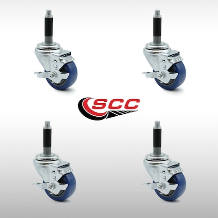 Stainless Steel Polyurethane Swivel Expanding Stem Caster Set of 4 w/3" x 1.25" Blue Wheels and 3/4" Stems - Includes 4 with Top Lock Brakes - 1200 lbs Total Capacity - Service Caster Brand