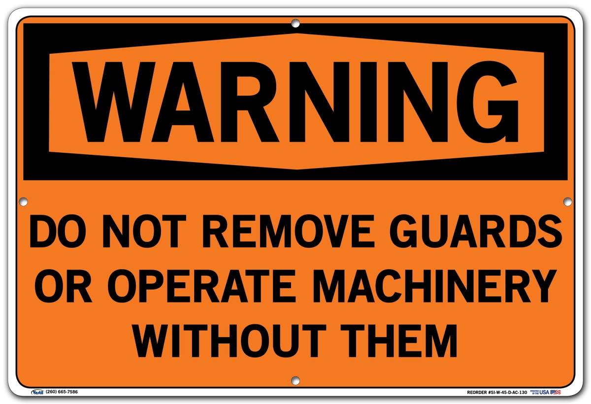 Vestil SI-W-45-D-AC-130 DO NOT Remove Guards OR Operate Machinery Without Them Warning Sign, Aluminum Composite, 0.130" Overall Size, 18.5" W x 12.5" H