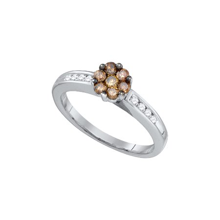 <p><span style="font-size:16px;"><b><u>Description</u></b><br /></span></p> <p><span style="font-size: 14px;">10kt White Gold Womens Round Cognac-brown Colored Diamond Cluster Ring 1/2 Cttw</span></p> <br /> <p><span style="font-size:16px"><u><b>Gemstone Details</b></u></span></p> <p><span style="font-size:14px">1/2 Carats total weight<br /><br />All diamonds are natural and conflict-free in origin<br /><br /></span></p> <ul type="square"> <b>Round Colored Brown Diamond</b> <br /> <li>3/8 ct.t.w.</li> <li>I2-I3 clarity</li> <li>Brown color</li> <li>Cluster setting</li> </ul> <br /> <ul> <b>Round Diamond</b> <br /> <li>1/8 ct.t.w.</li> <li>I2-I3 clarity</li> <li>H-I color</li> <li>Channel setting</li> </ul> <br /> <p><span style="font-size:16px"><u><b>Specifications</b></u><br /></span></p> <p><span style="font-size:14px">10kt White Gold<br />Widest point width: 6.5 mm (.26 inches )<br />Width of shank: 1.5 mm<br />2.66 grams (approximately)<br />Ring size selectable</span></p> <p><span style="font-size:11px">All colored diamonds are treated to permanently alter their appearance.</span></p> <p><span style="font-size:11px">Combined diamond weight of 1/2 carats total weight represents a range of 0.46 - 0.58 cts. t.w.</span></p>