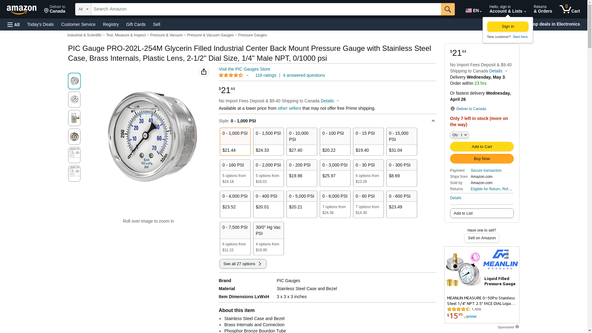 SpecificationsDial: 2 1/2 (63mm)Range: 0/1000 psi/BAR (x100 = kPa)Case: Stainless steel, glycerine filledWetted Parts: Copper alloyBezel: Stainless steel, fixedLens: PolycarbonateFill Fluid: GlycerinePointer: Black aluminumConnection: Center back mount, 1/4 NPTAccuracy: 2-1-2% of span, ASME B40.1 Grade AAmbient Temp: 30F to 160F Accuracy +/- 2-1-2% Application Hydraulic / Fluid Power Case Material Stainless Steel Connection Location Center Back Connection Size 1/4 NPT Dial Size 2-1/2 Face Type Glycerin Filled Internal Material Copper Alloy Lens Material Polycarbonate Pressure Rating 0 - 1000 psi Stem Length Standard Style Threaded Temperature 30°F - 168°F Type Pressure Gauge Product Weight 0.45 Notes 2-1/2 Dial 0 - 1000 psi S/S Case Internal Brass 1/4 NPT CBM Liquid Filled Pressure Gauge Glycerine filled for added durability in applications where vibration or pulsation is present For hydraulic and industrial applications