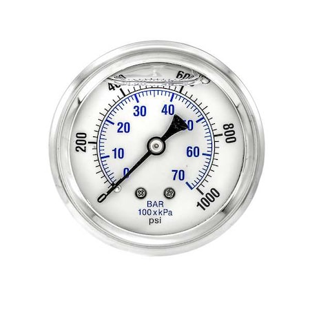 PIC Gauges - PRO-202L-254M - 2-1/2 Dial 0-1000 psi S/S Case Brass Internals 1/4 NPT CBM Liquid Filled Pressure Gauge