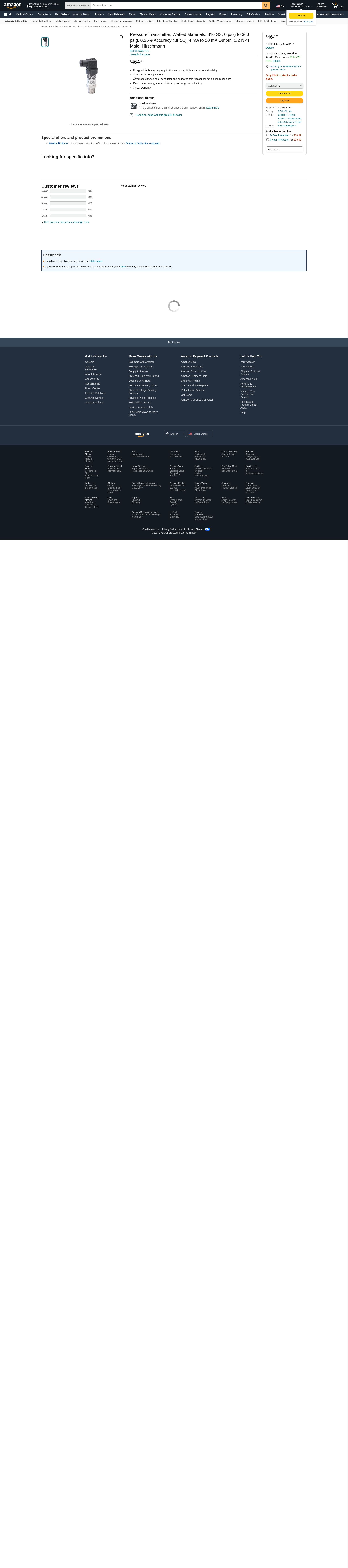 Pressure Transmitter, Wetted Materials: 316 SS, 0 psig to 300 psig, 0.25% Accuracy (BFSL), 4 mA to 20 mA Output, 1/2 NPT Male, Hirschmann