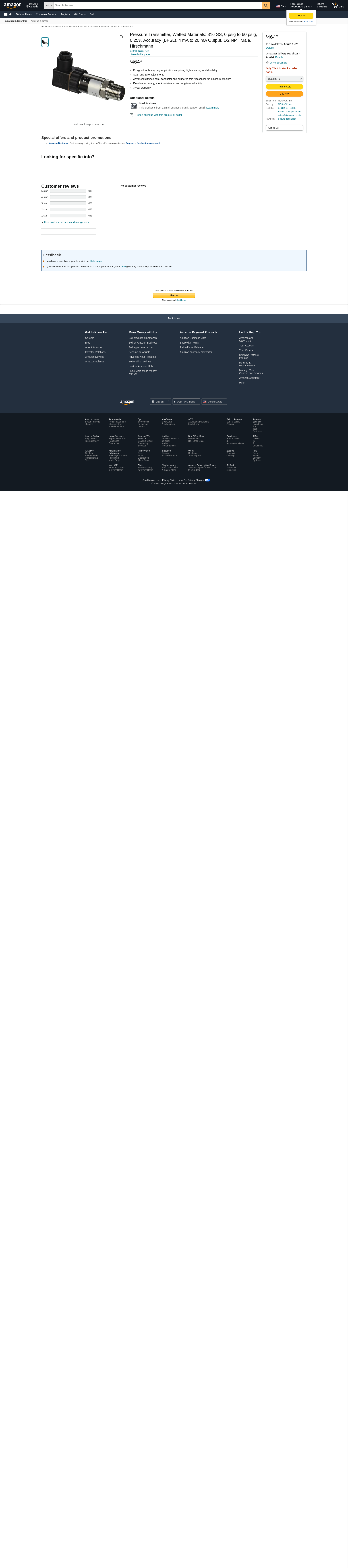 Pressure Transmitter, Wetted Materials: 316 SS, 0 psig to 60 psig, 0.25% Accuracy (BFSL), 4 mA to 20 mA Output, 1/2 NPT Male, Hirschmann