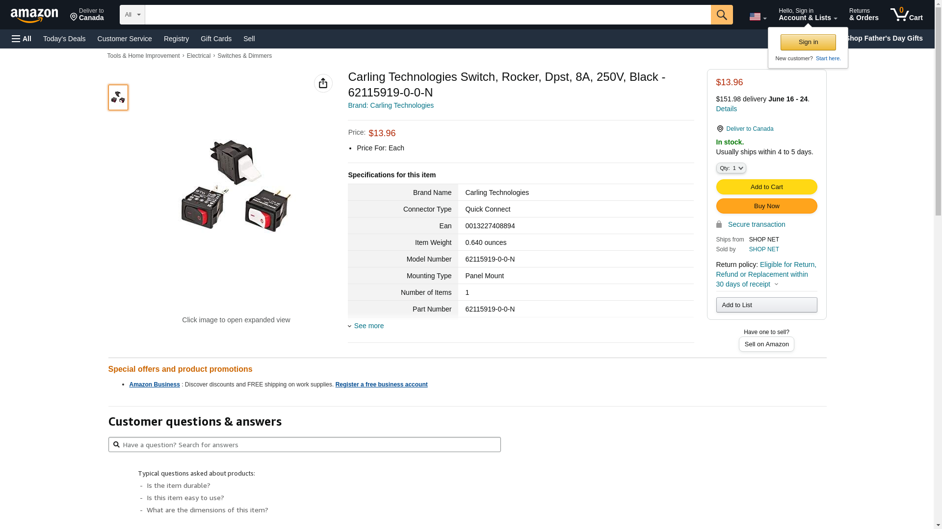 | Feature | CARLING TECHNOLOGIES 62115919-0-0-N SWITCH, ROCKER, DPST, 8A, 250V, BLACK |