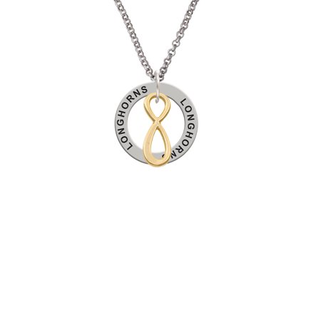 Medium Elegant Gold Tone Infinity Sign Longhorns Affirmation Ring Necklace. Medium Elegant Gold Tone Infinity Sign charm is approx. 0.79 x 0.28 x 0.06 inches (HxWxD) not including loop. Smooth on both sides. Silver tone 2mm Belcher Chain Necklace is approx. 23 Inches with a Lobster Claw Clasp. Affirmation Ring is approx. 0.86 x 0.86 x 0.05 (HxWxD). This inspirational piece of jewelry is very meaningful. Its circular shape is symbolic for endless belief in the message that is imprinted around the ring. These are motivational or sentimental messages to the wearer. Makes a great gift for Birthdays! PLEASE NOTE: Our products are lead safe, but are not intended for children 14 years and younger.