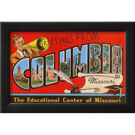<ul> <li>Title: Greetings from Columbia, Missouri</li> <li>Product Type: Framed Art Print</li> <li>Framed in SOHO Black</li> <li>Arrives ready-to-hang for fast, simple installation</li> <li>Framed Size: 17x11.5 in.</li> <li>Handcrafted in the USA</li> </ul>