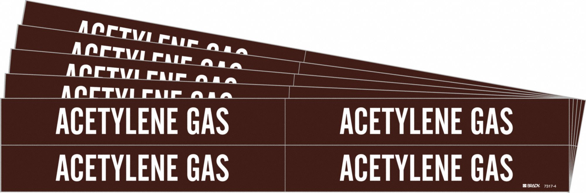 Pipe Marker, Pipe Marker Mounting Style Adhesive Pipe Marker, Pipe Marker Legend Acetylene Gas, Legend Text Color White, IIAR System Abbreviation Not Applicable, IIAR Phase Not Applicable, IIAR Pressure Level Not Applicable, Character Height 3/4 in, Background Color Brown, With or Without Arrows Without, Package Quantity 5