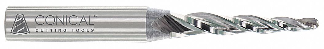 45.0 Degree HSS Tapered End Mill - 4 Flute 1/8'' Tip Diameter 2.1250'' Large Diameter ,1'' Shank ,1'' Length of Cut 45.0? HSS TEM - 4 Flute x 1/8'' Tip x 2.1250'' LD x 1'' Shank x 1'' LOC x 3 3/4'' OAL w/ Ball End Conical Part #WA-204ASP-BE