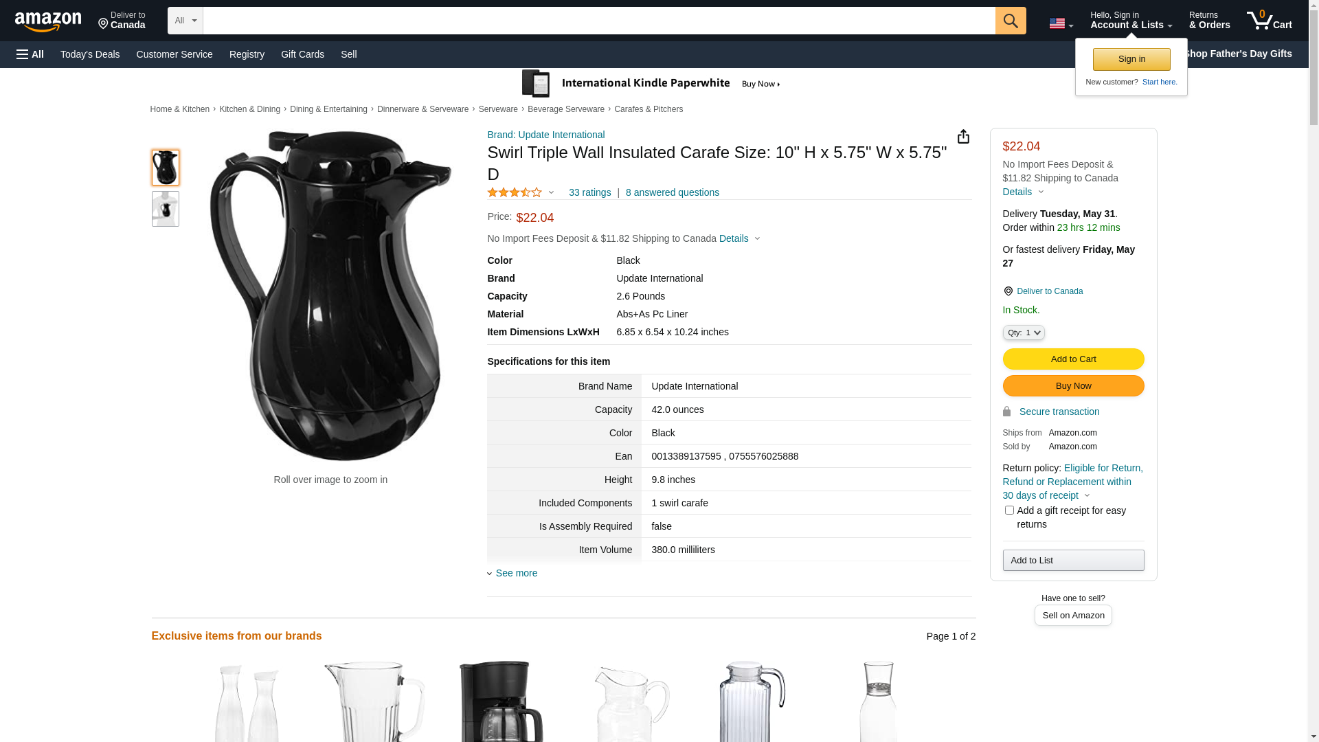 Update International Insulated Black 42 Oz Swirl Carafe w/ Push-ButtonServe coffee or tea in this attractive, swirl insulated server. This server is insulated to keep liquids hot.Model #: FB3022/40 Insulated Push button top Color: Black Gift boxed Capacity: 42 oz Height: 10 215627