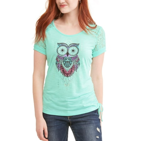 No Boundaries Juniors' Graphic Side Tie Lace Yoke Short Sleeve T-Shirt