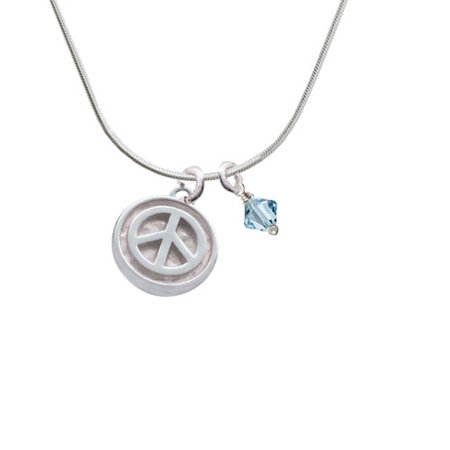 Silver Tone Peace Sign - Round Seal - Hot Blue Bicone Crystal Necklace. Silver Tone Charm. Charm size is approx. 0.76 x 0.65 x 0.12 inches (HxWxD) including loop. 18 Inch Snake Chain Necklace with a Lobster Claw Clasp. Hand wrapped crystal bicone is approx: 6mm. We use Swarovski Crystallized Elements. Available in many colors. We are a family owned company in the U.S.A. since 1977. PLEASE NOTE: Our products are lead safe, but are not intended for children 14 years and younger.