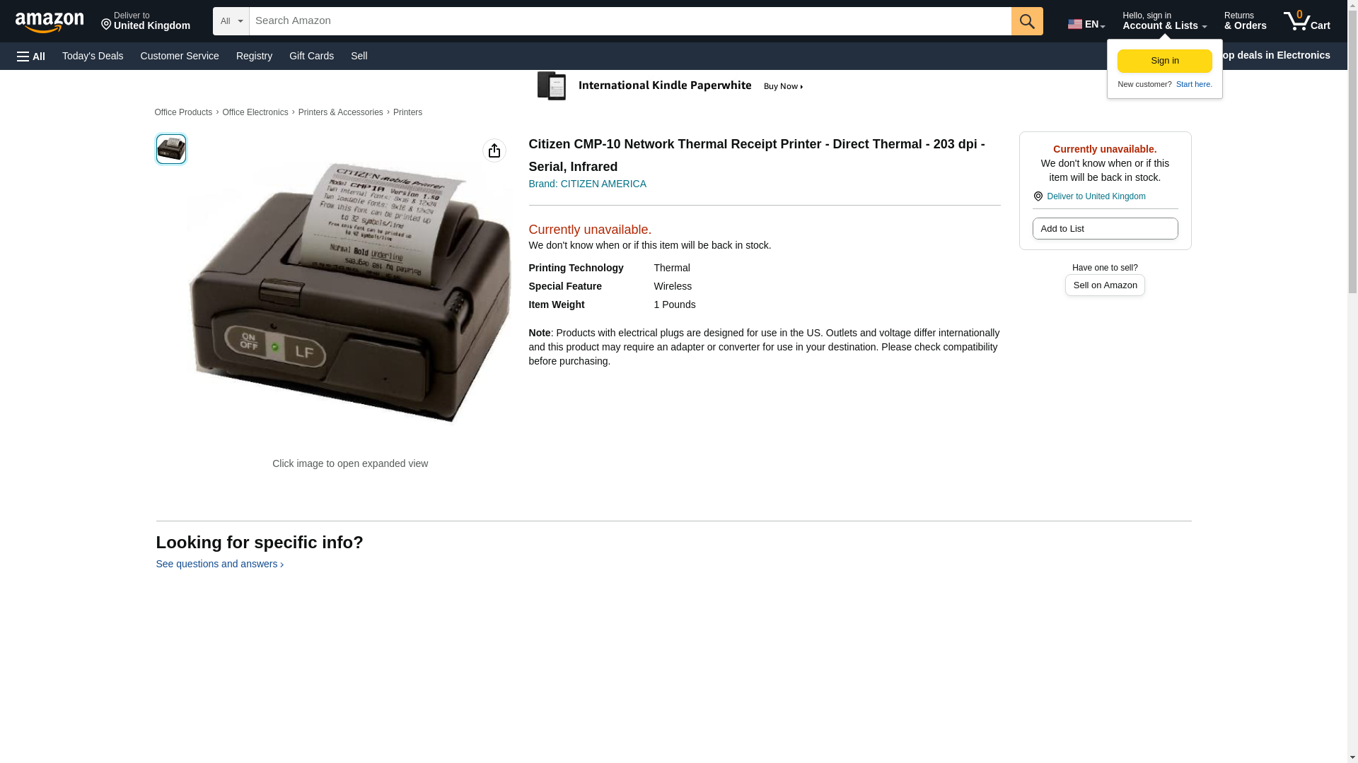 Citizen CMP-10 Network Thermal Receipt Printer - Direct Thermal - 203 dpi - Serial, Infrared