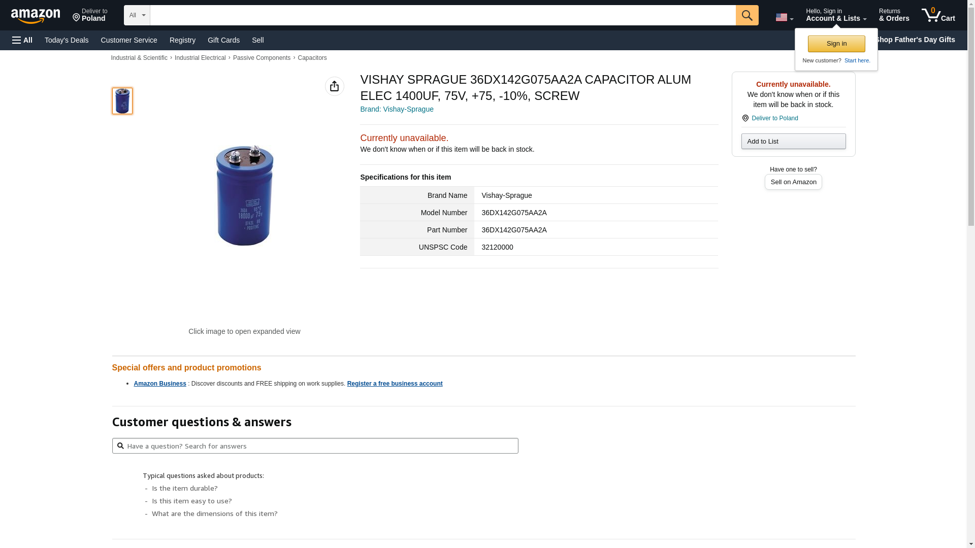 VISHAY SPRAGUE - 36DX142G075AA2A - CAPACITOR ALUM ELEC 1400UF; 75V; +75; -10%; SCREW