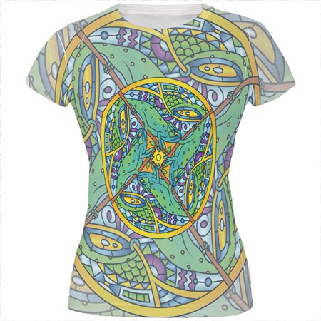 A trippy stained glass chameleon design is featured in a mandala pattern. This Animal World design is printed on a cotton/polyester junior's T-shirt. The dye sublimation printing process creates slight imperfections that are unique to each item.