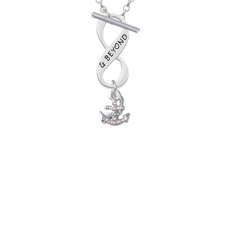 Silver Tone Mini AB Crystal Anchor & Beyond Infinity Toggle Chain Necklace. Silver Tone Mini AB Crystal Anchor charm is approx. 0.36 x 0.36 x 0.09 inches (HxWxD) not including loop. Anchor is 3-D with clear AB crystals on the front. The anchor symbolizes hope, safety, fidelity, salvation, and a connection to the sea. 3mm Rolo Chain Necklace is 18 inches long. Infinity Toggle is approx. 0.90 x 0.40 x 0.10 inches (HxWxD). The infinity symbol represents the quality of being limitless or endless. Choose your favorite message to represent your love, faith, or commitment that lasts forever. We are a family owned company in the U.S.A. since 1977. PLEASE NOTE: Our products are lead safe, but are not intended for children 14 years and younger.