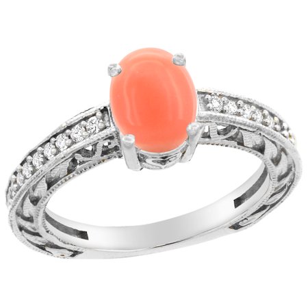 14K Gold Natural Coral Ring Oval 8x6 mm Diamond Accents, sizes 5 - 10