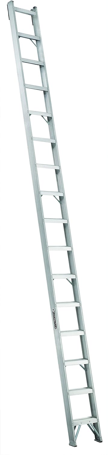 A 16-Foot extra heavy duty Aluminum shelf ladder. Duty rating of 300-Pound. For all demanding industrial applications. Steps are level when the ladder is set at 18 Degree. Rubber Bumper - Ladder has parallel sides with thick rubber bumpers extending 6-Inch down the side rails for protection of landing surface and stability. Two pair of heavy duty steel gussets support bottom step Aluminum angle feet with thick rubber tread on both legs to provide sure footing and stability. Feet can be replaced when necessary. Double-Rivet Step Construction - Each step secured with six, large headed, semi-tubular steel rivets for maximum strength. This ladder is ideal for getting to shelves with Narrow aisles when standard ladders will not fit.
