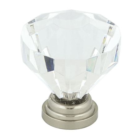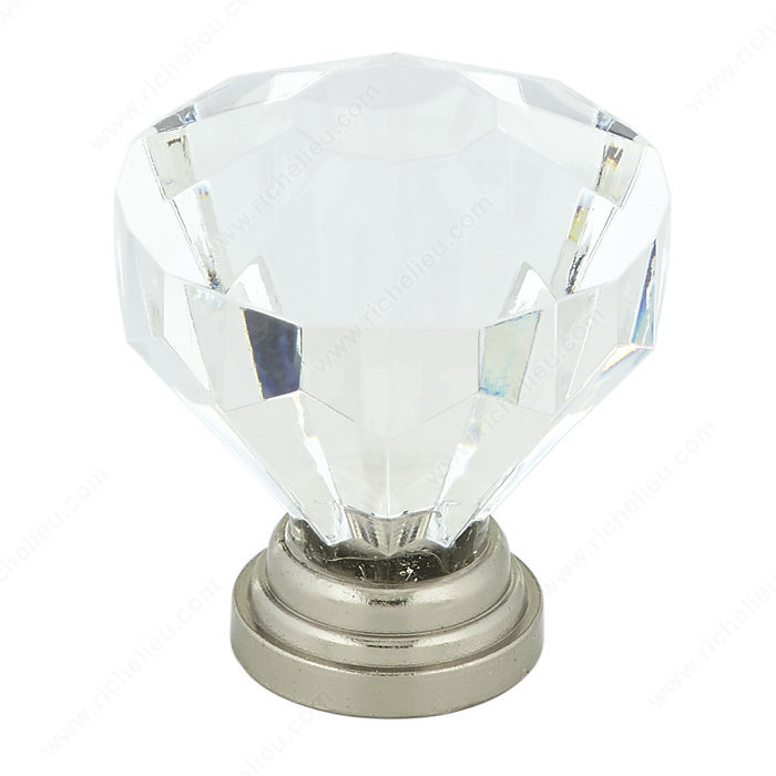 BP1008019511 Features: -Finish: Brushed nickel/clear. -Material: Metal/acrylic. -Screw/nail: 8/32 (Included). Knob Type: -Crystal Knob. Style: -Contemporary. Finish: -Brushed nickel; Clear. Fasteners Included: -Yes. Dimensions: Overall Height - Top to Bottom: -1.25". Overall Width - Side to Side: -1.25". Overall Depth - Front to Back: -1.4". Overall Product Weight: -0.05 lbs.