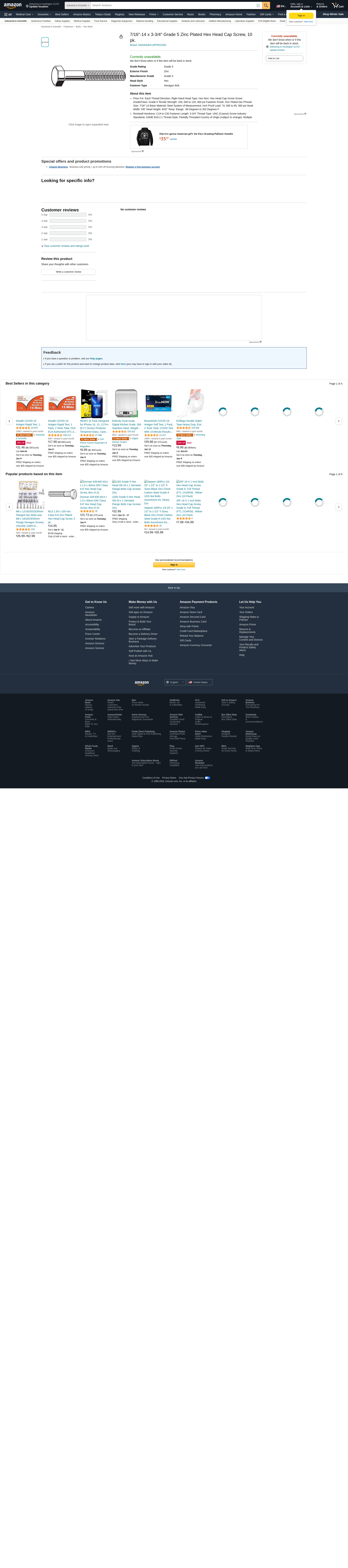 | Feature | <b>Price For:</b> Each <b>Thread Direction</b>: Right Hand <b>Head Type</b>: Hex <b>Item</b>: Hex Head Cap Screw <b>Screw Grade/Class</b>: Grade 5 <b>Tensile Strength</b>: 105, 000 to 120, 000 psi <b>Fastener Finish</b>: Zinc Plated <b>Dia./Thread Size</b>: 7/16"-14 <b>Basic Material</b>: Steel <b>System of Measurement</b>: Inch <b>Proof Load</b>: 74, 000 to 85, 000 psi <b>Head Width</b>: 5/8" <b>Head Height</b>: 9/32" <b>Temp. Range</b>: -58 Degrees to 302 Degrees F |